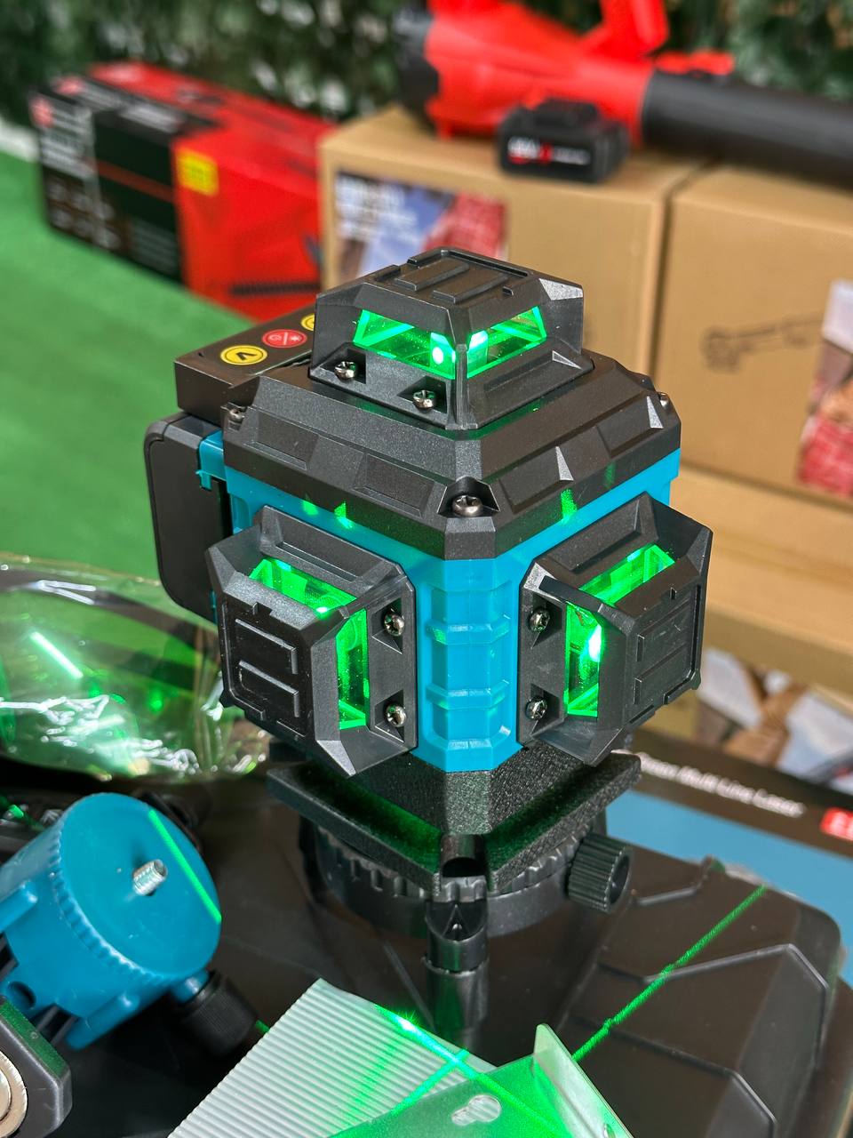 🟢 Laser verde 4D (16 linhas): alta visibilidade (515 nm) e cobertura 360° para chão, paredes e teto.